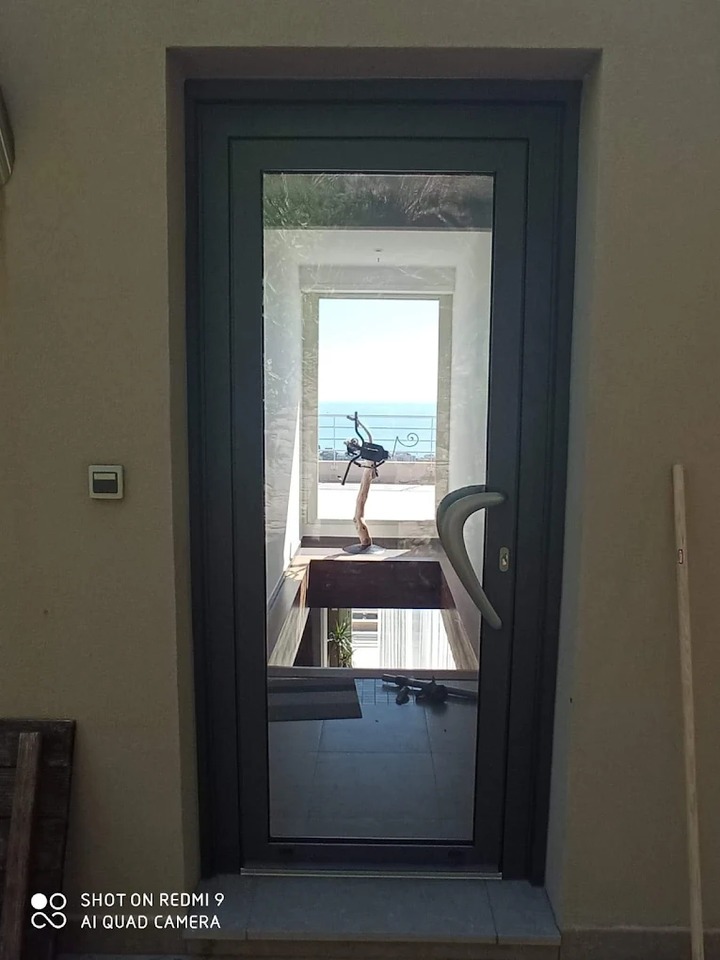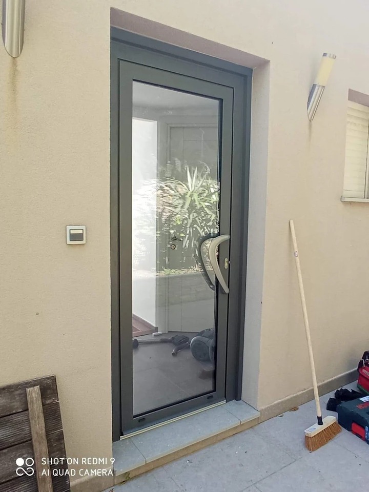 - Porte d'entrée / extérieure aluminium : design contemporain, coloris gris anthracite, poignée moderne, grande résistance aux intempéries