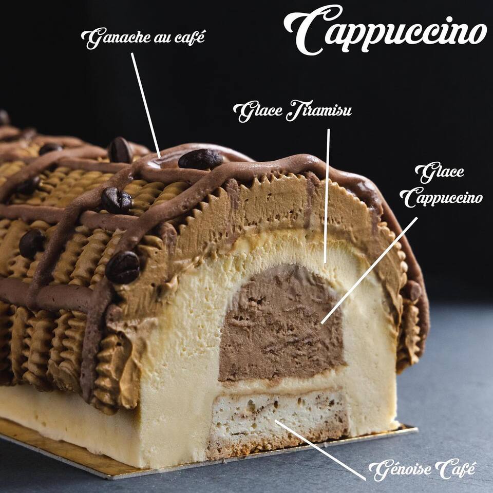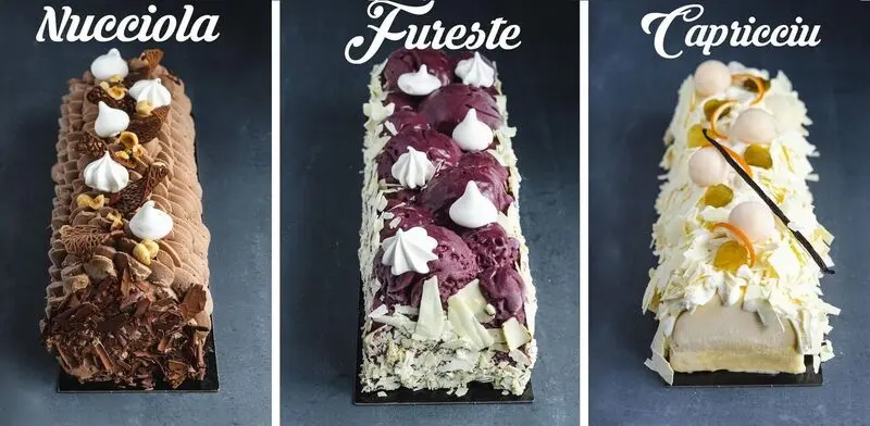 Chaque bûche est pensée comme un dessert de fête complet, associant glaces artisanales, inserts gourmands et finitions soignées.