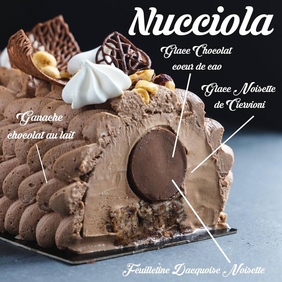 - Nucciola – Glace chocolat cœur cacao, glace noisette de Cervioni, ganache chocolat au lait, dacquoise noisette.